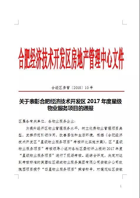 為提升物業(yè)管理服務(wù)水平,樹立優(yōu)秀物業(yè)管理項目典型,合肥市經(jīng)開區(qū)管理委員會和經(jīng)開區(qū)房地產(chǎn)管理中心聯(lián)合開展合肥經(jīng)濟技術(shù)開發(fā)區(qū)“星級物業(yè)服務(wù)項目”考核評比活動,根據(jù)考核評比實施方案,對通過初評的十個項目進行現(xiàn)場考核,最終1家榮獲四星物業(yè)服務(wù)項目,6家榮獲三星物業(yè)服務(wù)項目。為打造行業(yè)標(biāo)桿,我公司一直將提升服務(wù)品質(zhì)作為工作重點。公司按照業(yè)戶比例,為業(yè)主配備專屬樓管員,提高了服務(wù)效率,同時提升了物業(yè)管理服務(wù)質(zhì)量。工程人員定期對園區(qū)設(shè)施設(shè)備及公共區(qū)域每日例行巡查,定期維護保養(yǎng),做到“急業(yè)主之急,解業(yè)主之難”。秩序員對小區(qū)進行二十四小時不間斷的秩序維護、消防管控、交通車輛管理,為小區(qū)業(yè)主提供安全有序的居住環(huán)境。同時公司配備專業(yè)有素的保潔團隊,為了保證服務(wù)質(zhì)量,保潔員開展互查自查樓宇,不放過每一個角落,確保保潔服務(wù)達到業(yè)主滿意,為業(yè)主帶來潔凈的居住環(huán)境。