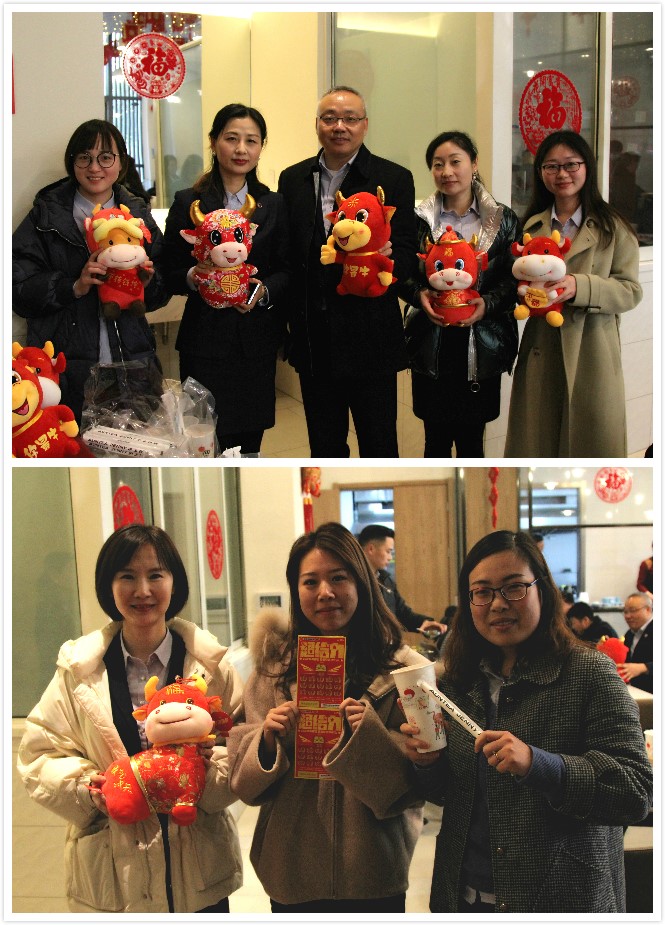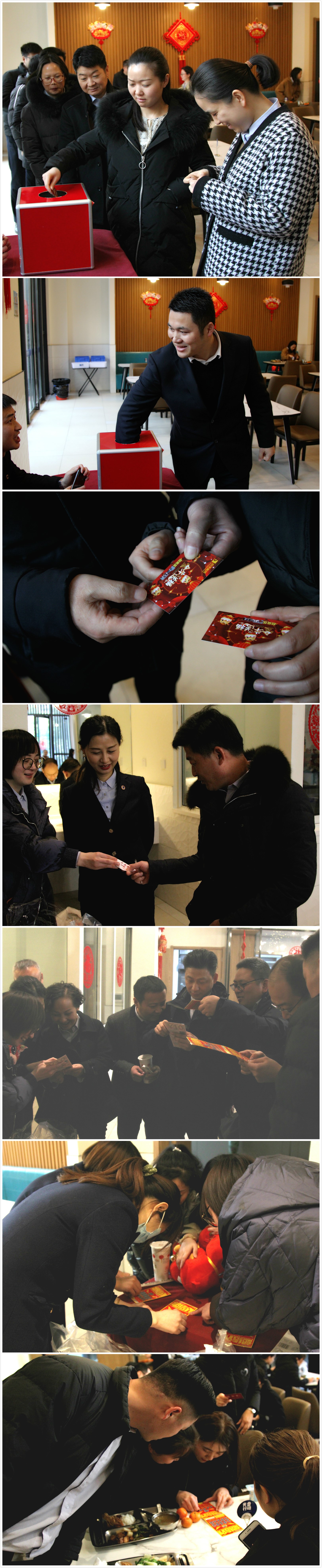 其實(shí),早在中午的時(shí)候,員工們就收到了另一份驚喜——趣味抽盲盒。精美的盲盒里藏著幸運(yùn),藏著喜悅,也藏著祝福?!拔页榈搅四滩琛薄拔页橹辛瞬势币粡垺薄拔乙仓歇?jiǎng)了,哇,是我最喜歡的牛氣沖天玩偶”“我最愛吃的徽面醬套餐抵用券,今年一定是我的幸運(yùn)年”……每一位參與的員工,都有禮品相送。最有意思的是刮彩票,大家湊在一起,眼睛盯著彩票,每刮中一個(gè),頓時(shí)爆出陣陣喝彩聲,活動(dòng)現(xiàn)場熱鬧非凡。