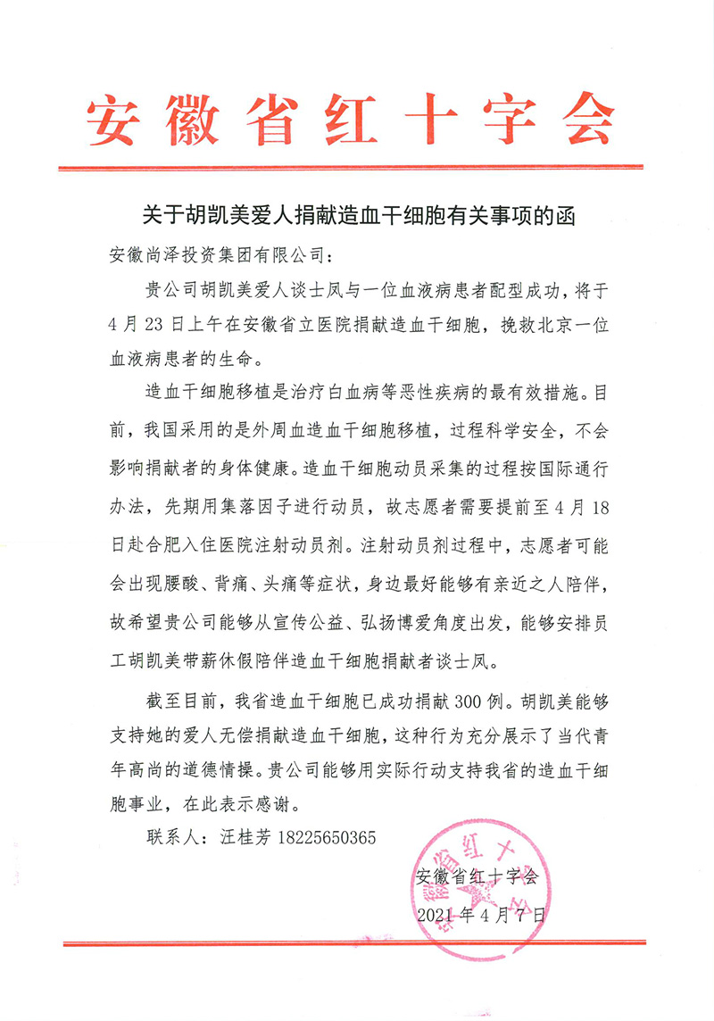 得知胡凱美支持愛人為素未蒙面的陌生人作出如此善舉時,集團(tuán)領(lǐng)導(dǎo)予以充分贊賞,特批她帶薪休假,全程陪伴照顧,還安排專人去醫(yī)院進(jìn)行了看望慰問。歷時將近一周,胡凱美一直陪在丈夫身邊,為他加油鼓勁。順利完成捐獻(xiàn)后,胡凱美和愛人臉上露出了開心的笑容。紅十字會領(lǐng)導(dǎo)現(xiàn)場為胡凱美愛人頒發(fā)了榮譽(yù)證書,對夫妻二人感人之舉致以了深深的敬意。安徽省紅十字會還特地發(fā)函到集團(tuán),對公司弘揚(yáng)社會正能量,用實(shí)際行動支持造血干細(xì)胞事業(yè)表示感謝。