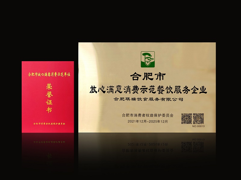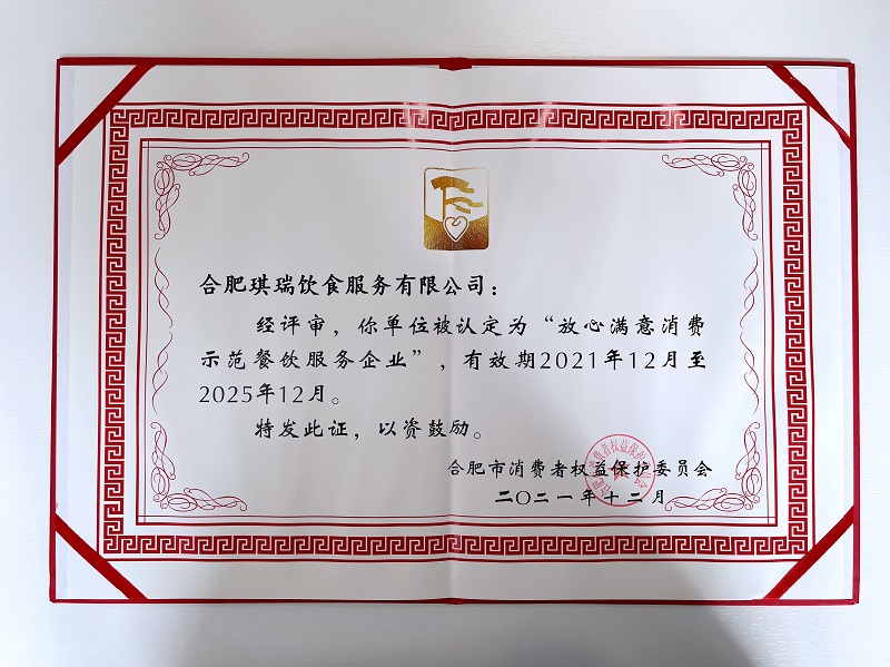 2022年3月15日,在合肥市消費(fèi)者權(quán)益保護(hù)委員會(huì)組織的“合肥市2021年放心滿意消費(fèi)示范單位評選”評選活動(dòng)中,合肥琪瑞飲食服務(wù)有限公司榮獲合肥市“放心滿意消費(fèi)示范餐飲服務(wù)企業(yè)”。