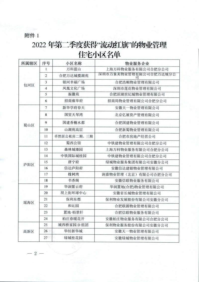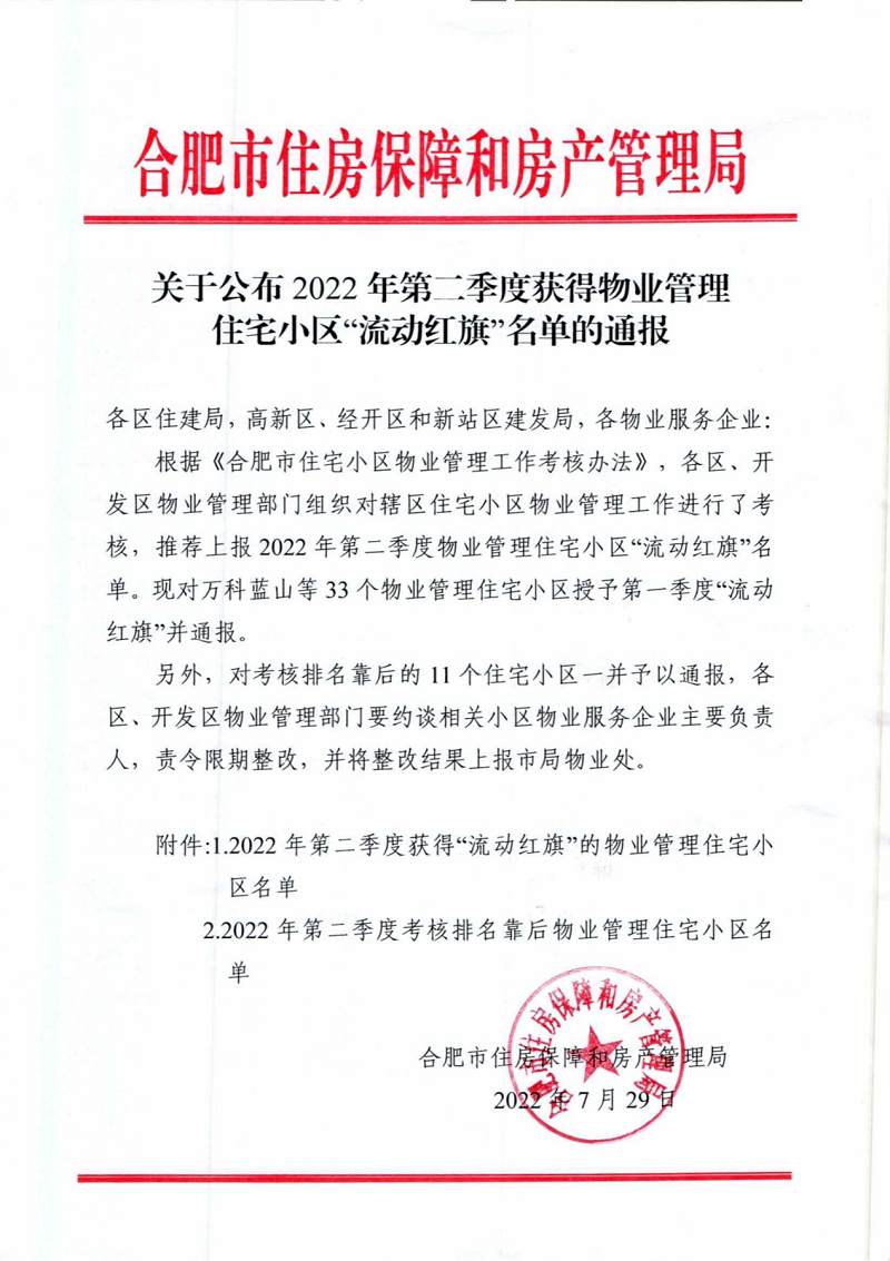2022年7月29日,尚澤瑞康物業(yè)公司大都會、百樂門雙項(xiàng)目通過2022年第二季度物業(yè)服務(wù)綜合測評,被授予合肥市物業(yè)管理住宅小區(qū)第二季度“流動紅旗”。